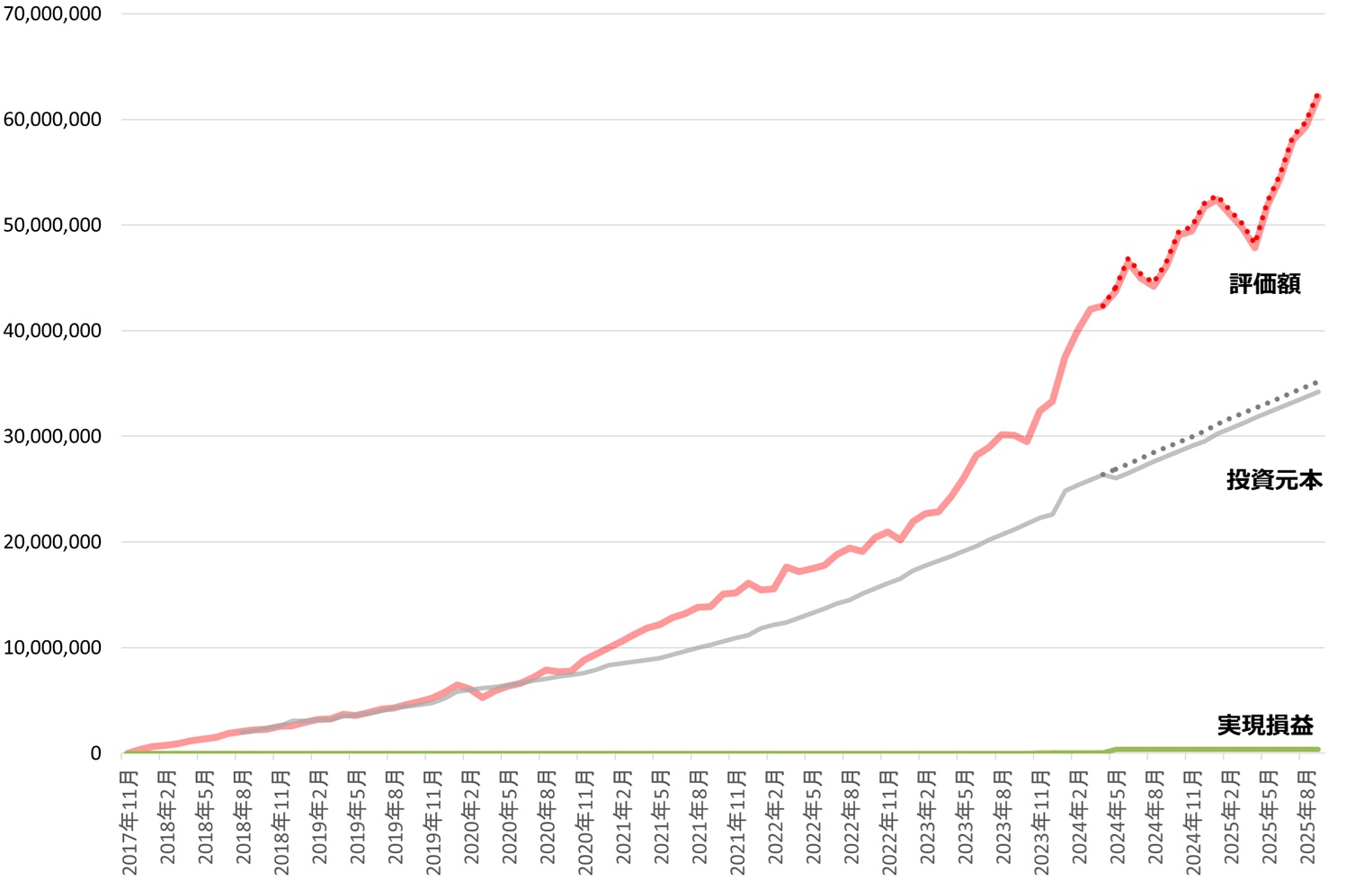 赤線が運用資産の評価額、灰線が実質的な投資金額、緑線が実現損益の推移です。また、赤破線は評価額+実現損益(投資による総リターン)、灰破線は累積投資元本です。